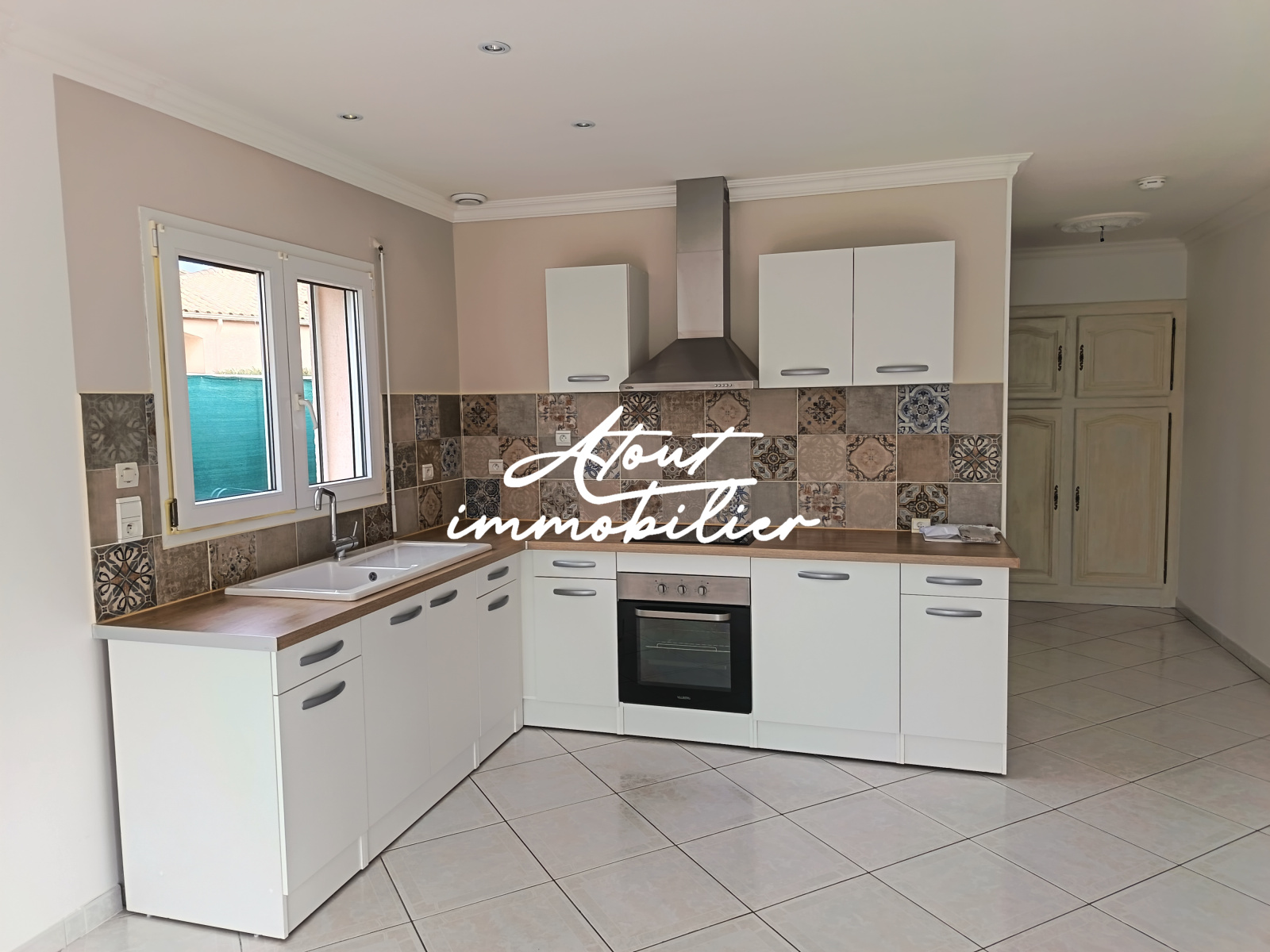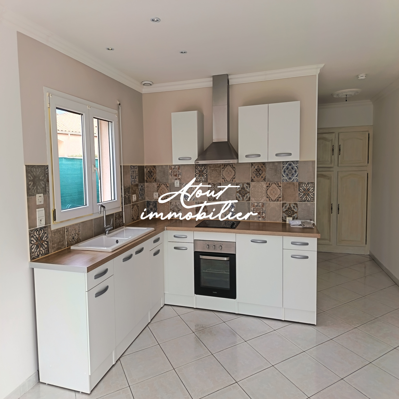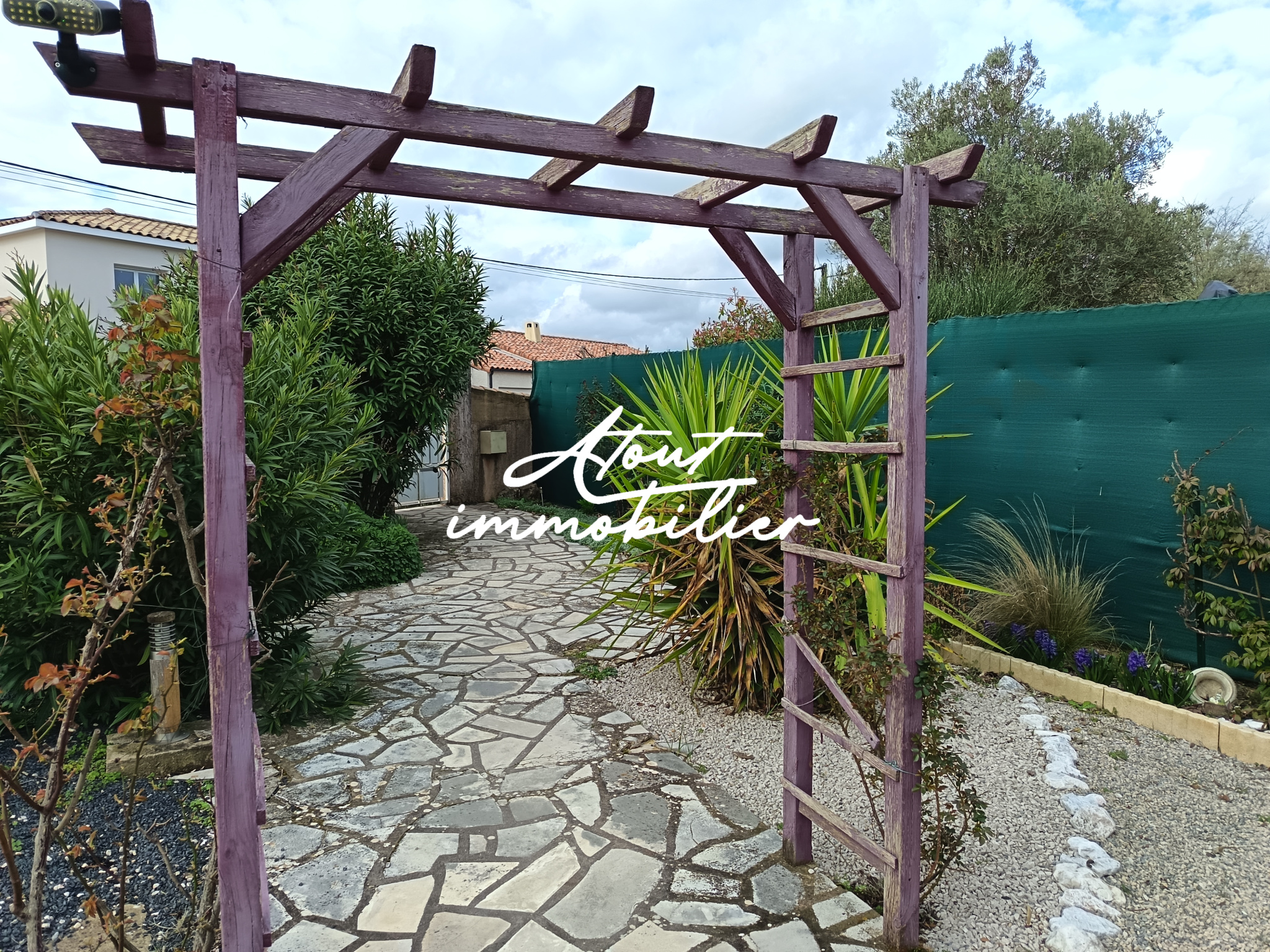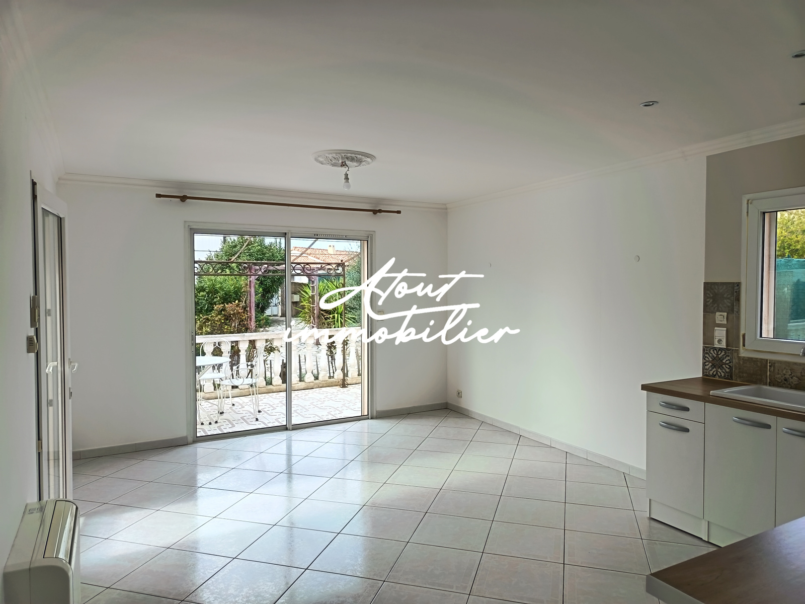 Sa composition est simple , la maison est mitoyenne de deux cotés offrant une cuisine neuve aménagée et équipée ouverte sur un séjour lumineux donnant sur une terrasse . Climatisation réversible .